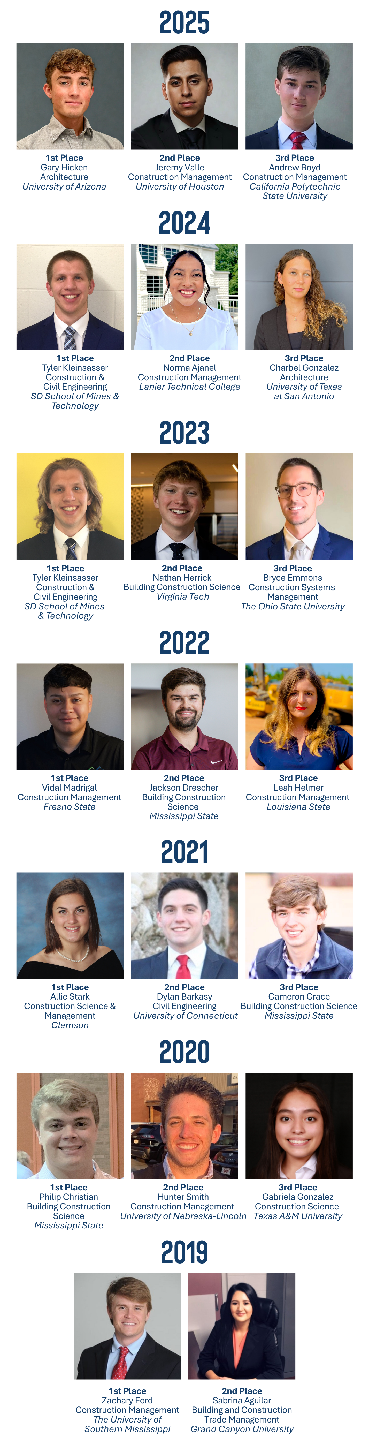 First awarded in 2019, the NASCLA Scholarship Program has since provided mentorship and support to more than 20 students pursuing careers in the construction industry. Explore past recipients below.